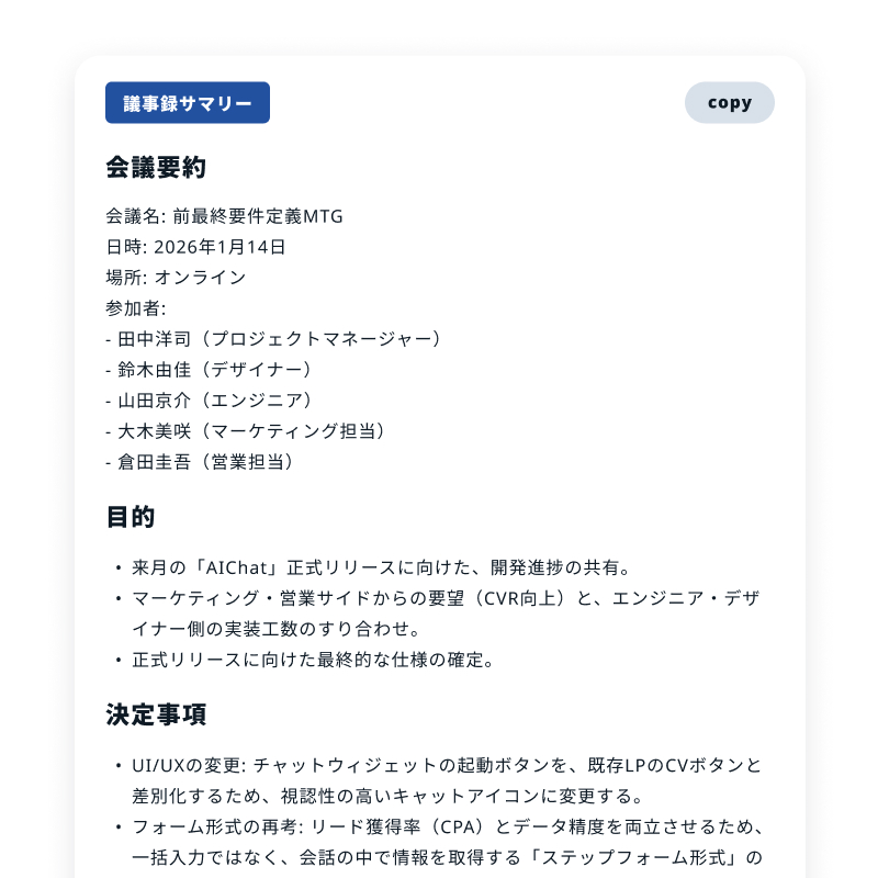会議を録るだけで、あらかじめ登録した議事録フォーマットに自動変換。AIに最適化した形式で保管、そのまま業務や社内共有に使えるため、会議後の作業時間を大幅に削減できます。