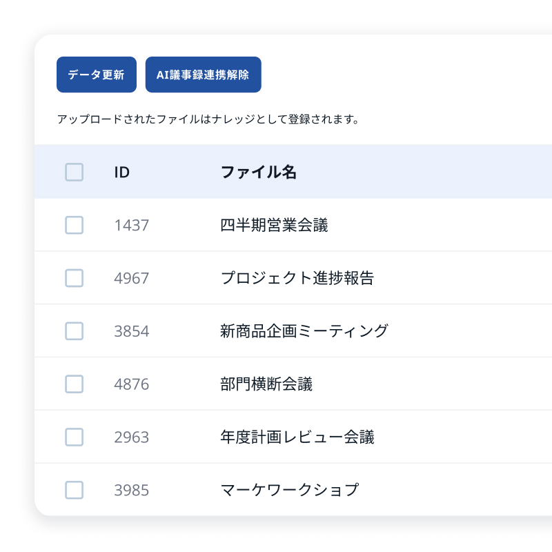 議事録を蓄積し、RAGと連携することで、過去の会議内容をAIが検索・回答。確認や引き継ぎのたびに人へ聞く必要がなくなり、会議データが組織の知識として活用されます。
