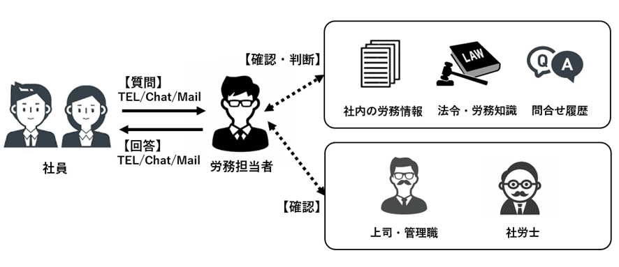 図1は、日本企業における一般的な労務担当者の問い合わせ対応業務フローを示したものである。労務担当者は、問い合わせを受領した後、まず内容を整理し、関連する就業規則、各種規程、運用マニュアル、法令情報などを確認する。この段階で判断が可能な場合は、そのまま社員に回答が行われる。