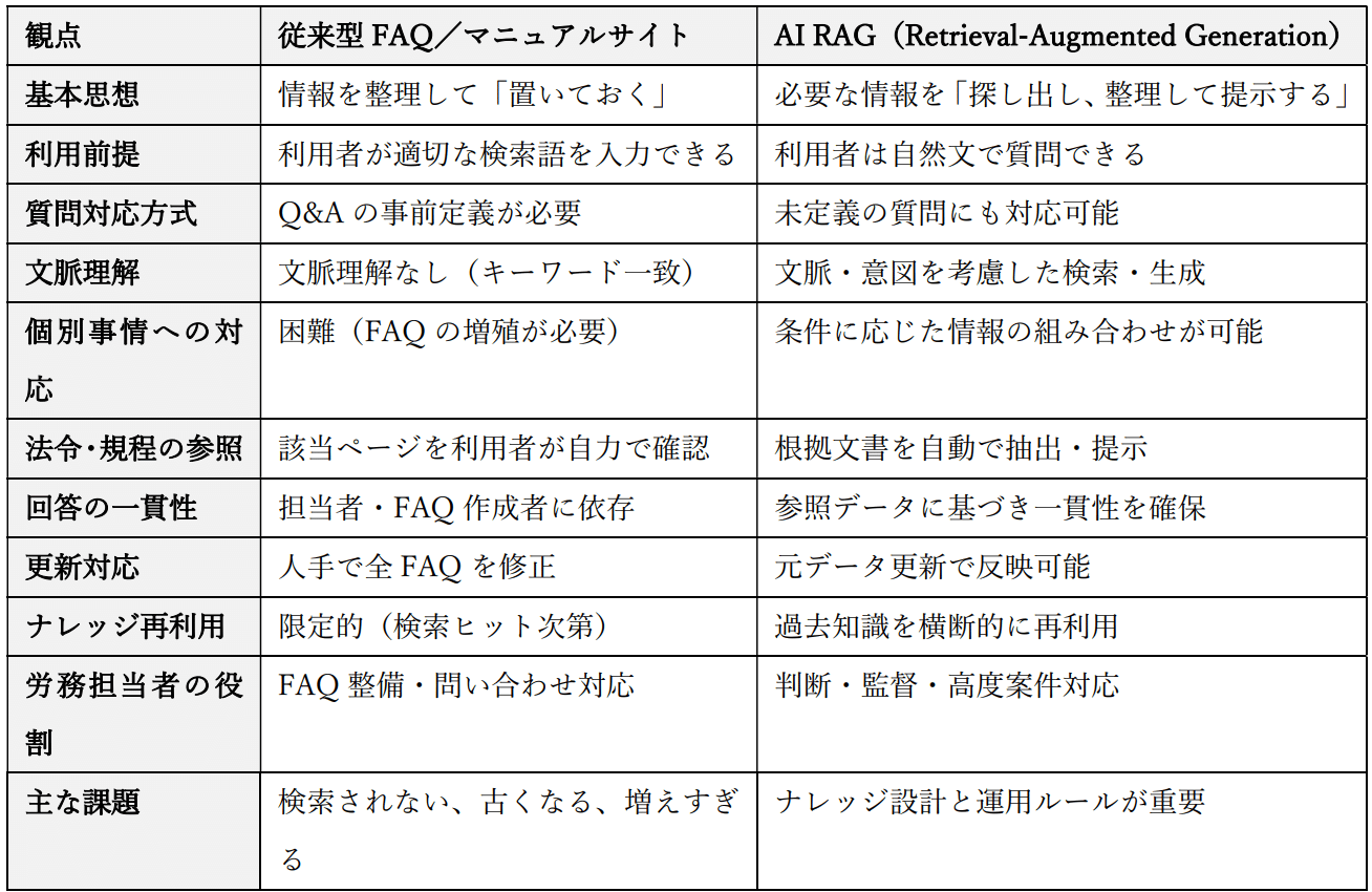 この点を明確にするため、表1において、従来型FAQ・マニュアルサイトとAI RAGを労務業務への適合性という観点から比較する。
